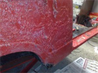 27 January 2008 - On to the tub Not such a long wait for this update! I have been busy finishing off the bulkhead so I can get on to the Tub, which is the only other major part to weld up. The doors are good and don't need any welding and the bonnet is a really good secondhand one that will just need rubbing down and painting. The Tub has been stacked up outside under a cover with various other bits including another chassis and a saloon tub, which is hopefully destined to become a rather fetching trailer for the old girl! The Bulkhead got several coats of white stonechip, primarily for protection but also because it has good soundproofing properties and will help reduce panel vibration when it is all together. It will all be topcoated so should look great when it is all done. I have managed to find a space under cover to put the finished bulkhead, it is all getting a bit tight on space for all my toys so I will have to hurry up and finish it! I am hoping the painter will approve of what I have done, as it should make his life a little easier. No I didn't stonechip the windscreen surround, as this is the only bit that is visible when all the doors and bonnet are on! Being able to get the bulkhead out of the garage has enabled me to bring in the tub and start work on that. As you can see, with everything else in the garage, it is a little cramped, but it is still better than working outside. My motorcycle lift is really helping and means that I don't have to lie on the floor to weld and my back is not suffering as much as it would have been! The tub is pretty rotten, although many new panels have been put on over the years, including rear wings, B-posts and wheel well. The sad thing is that the quality of the repairs are not that good and they have not been sealed very well, so the rot is already setting. I will have to do a number of repairs which should be okay once I get stuck in. I am a little concerned about one of the boot corners which is completely vanished and will need a lot of work, but maybe I will leave that until the end! So things are moving on and with a Triumph Show on the 10 Feb at Stoneliegh, I am hoping to get the welding done and the rolling chassis completed so it can go off to paint in 4 weeks time at the end of Feb. Ever hopeful aren't I?